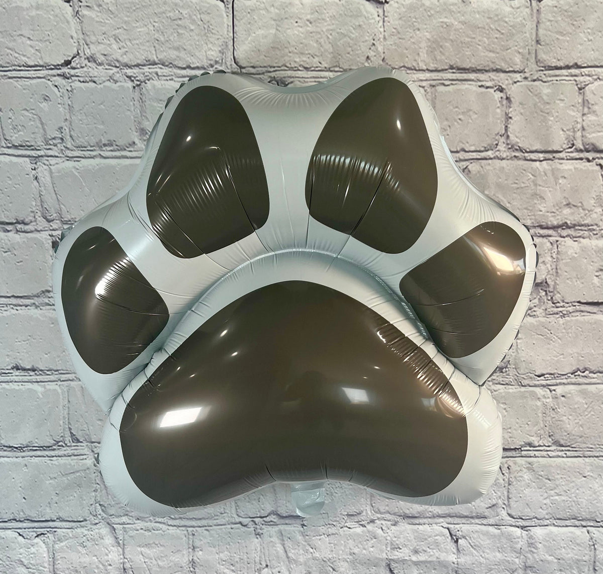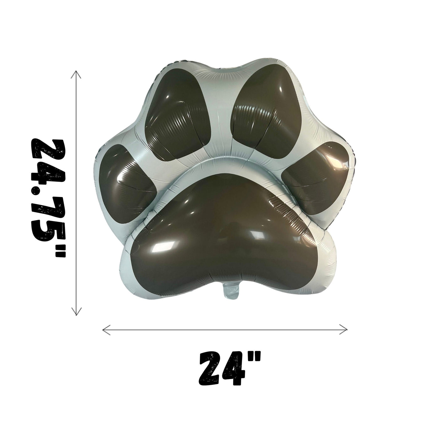 • Black and white dog paw print balloon sized about 24.75 by 24 inches for a strong themed focal point