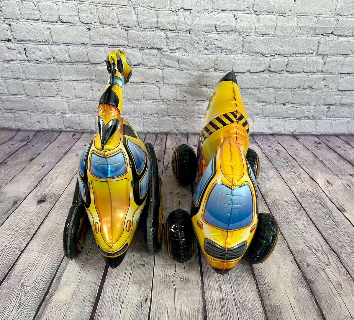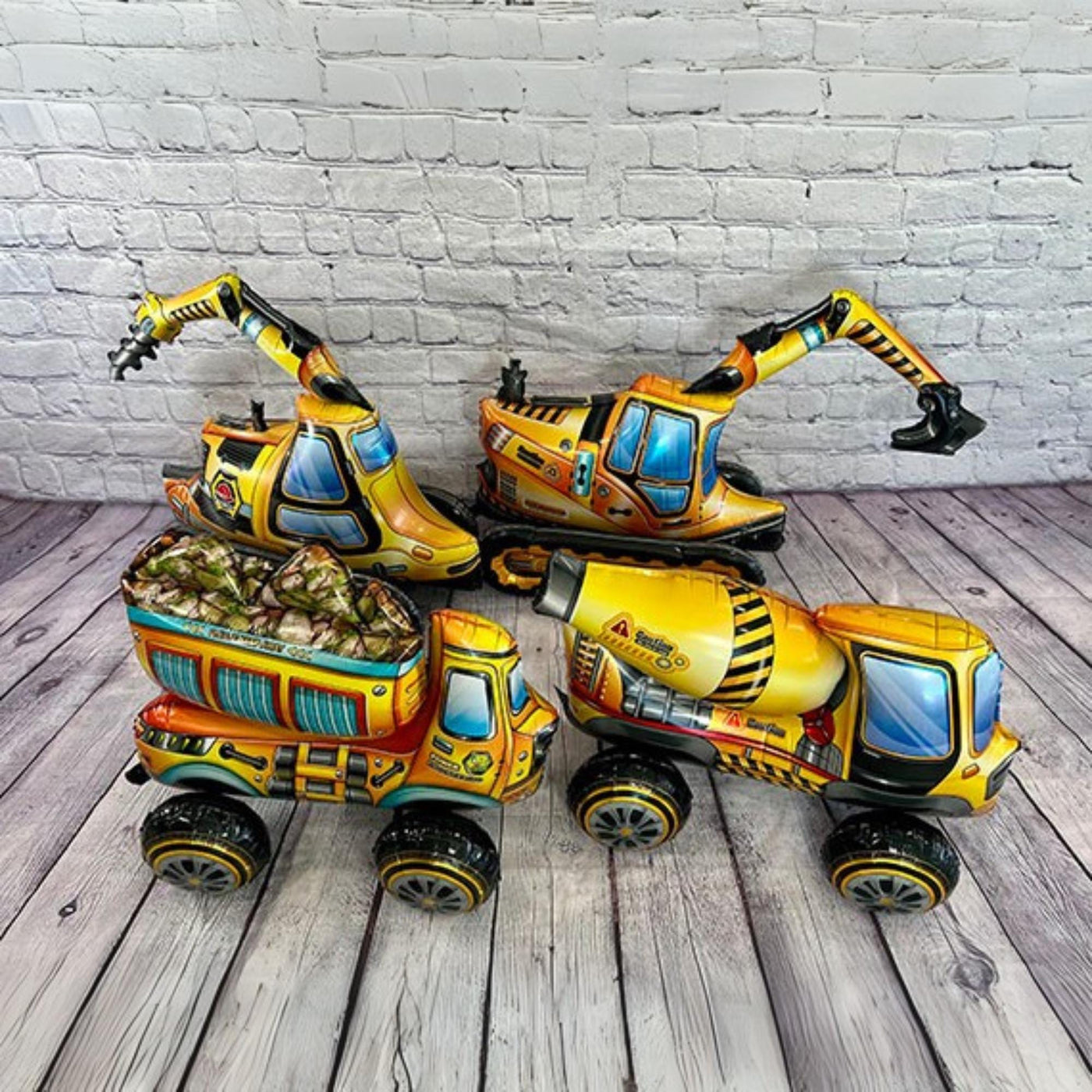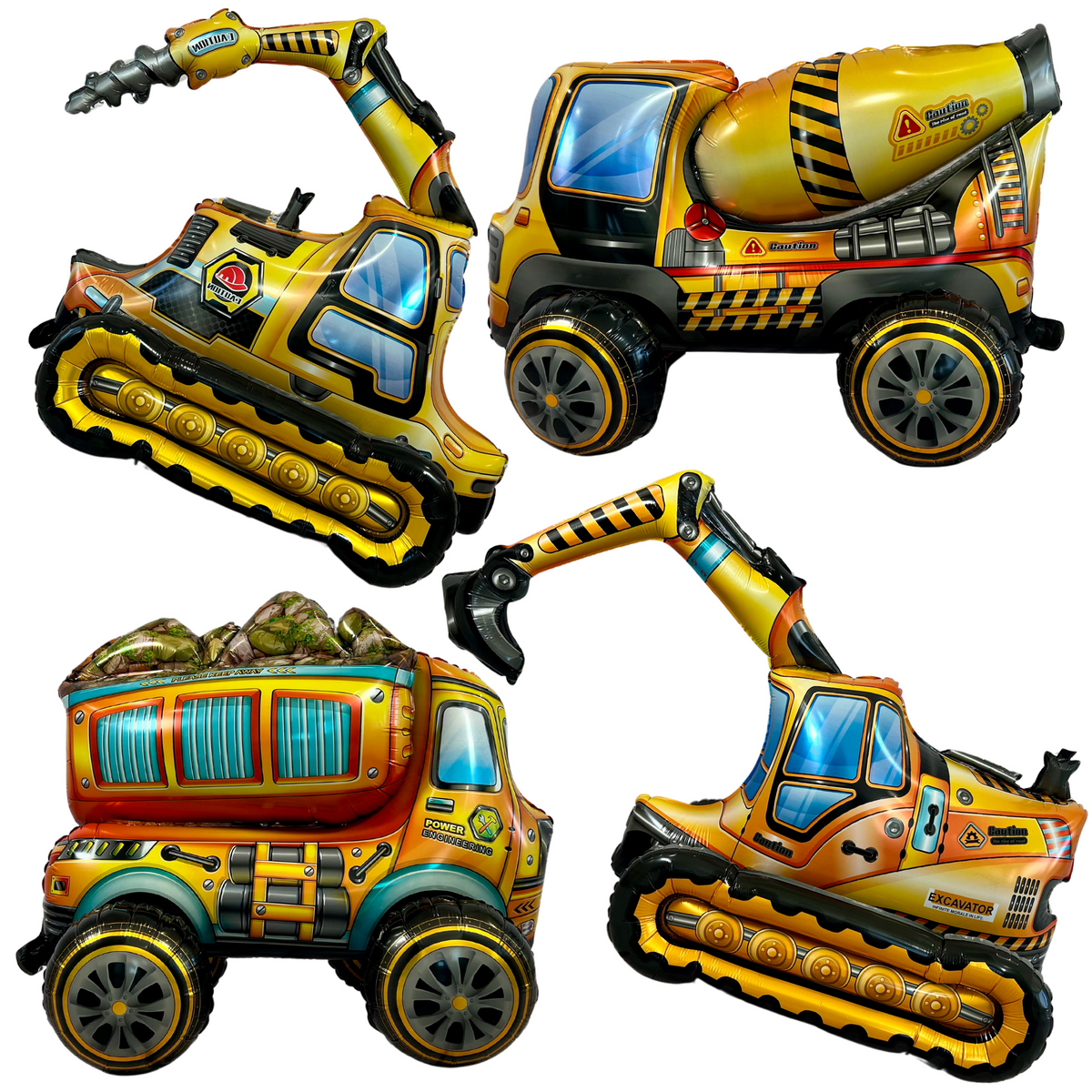 • This set of 4 jumbo 4D construction balloons includes drill car, lorry, excavator, and cement truck