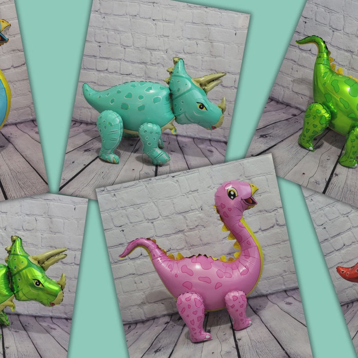 This set includes: -6 Premium 3D JUMBO inflatable dinosaur mylar balloons.