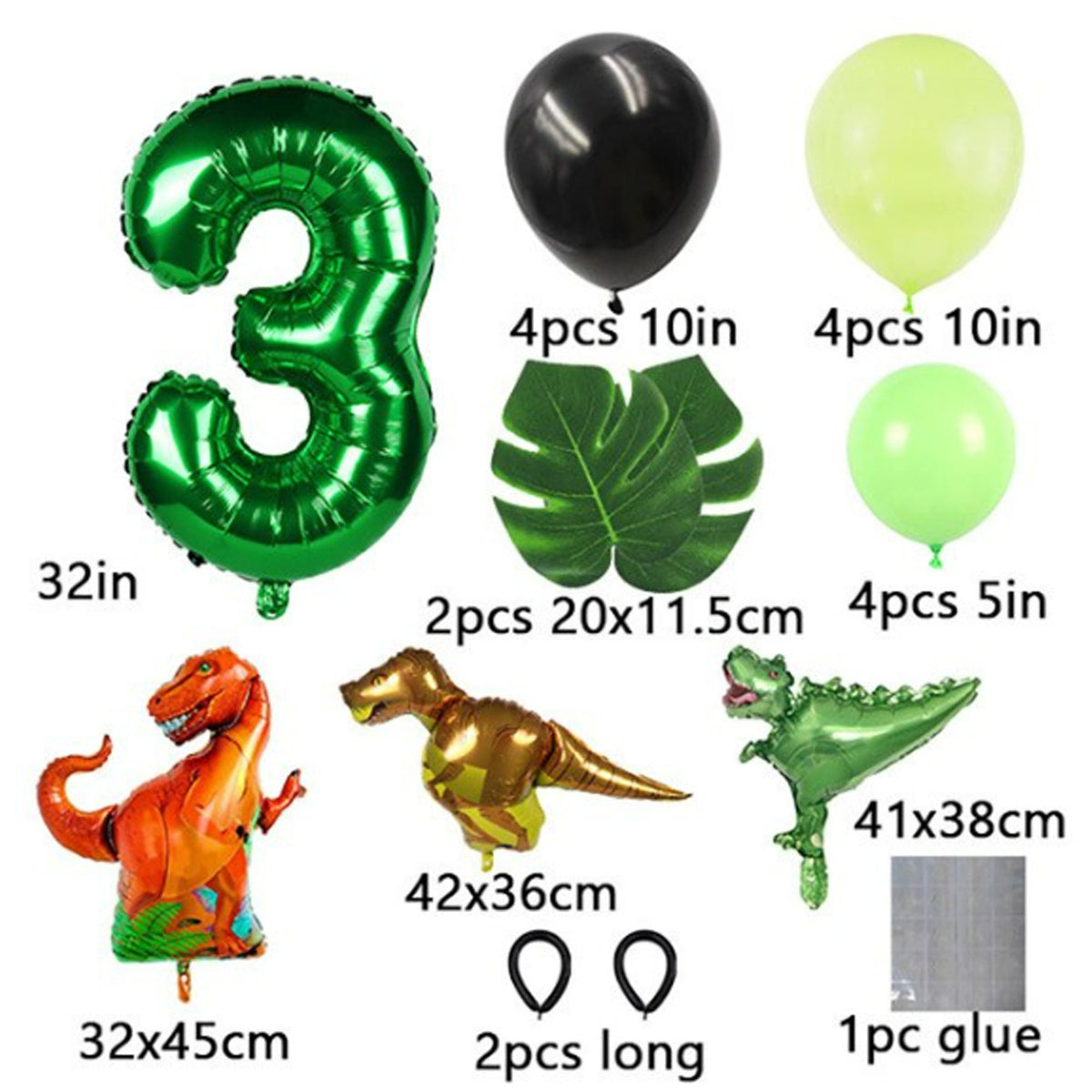 • Dinosaur balloon bouquet set includes jumbo green number balloon plus mini dinosaur balloons, latex balloons, and jungle leaves