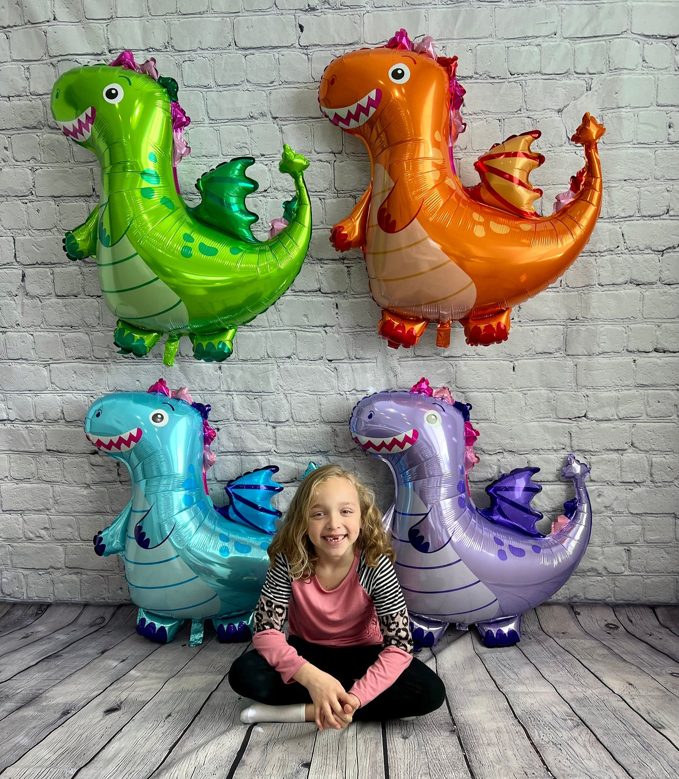 *4 Premium giant inflatable dragon mylar balloons in green, blue, purple and orange (approximately 30"L x 27"H).
