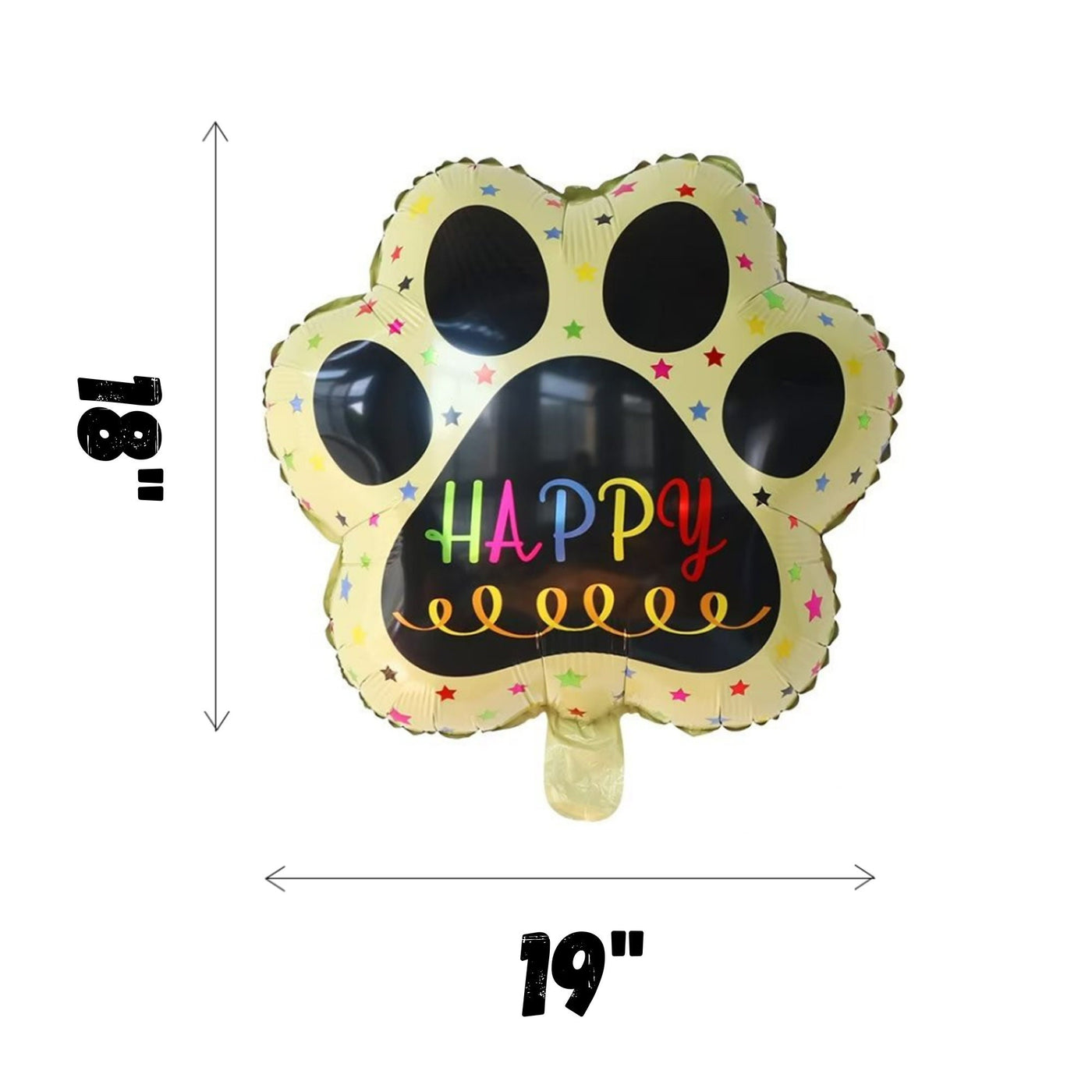 • Gold and yellow happy dog paw print balloon sized about 18 by 19 inches for a fun themed focal point