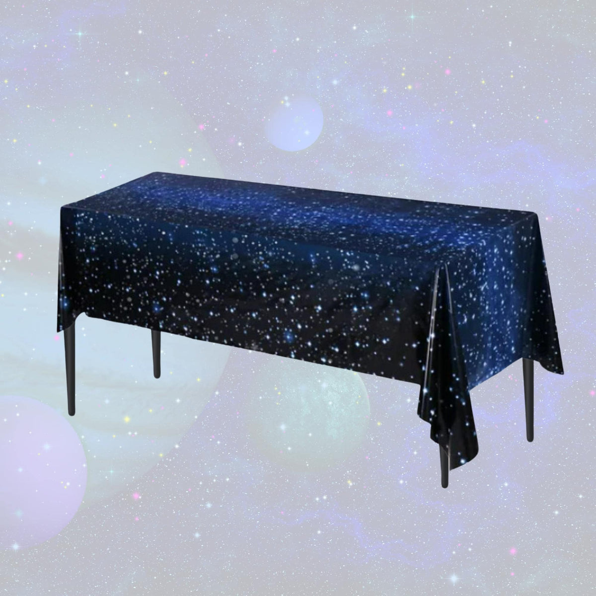 Outer space themed disposable and water resistant table cloth. Easily matches with your party theme decor! Use for birthdays, holidays, weddings, baby showers, gender reveals and just about any celebration.