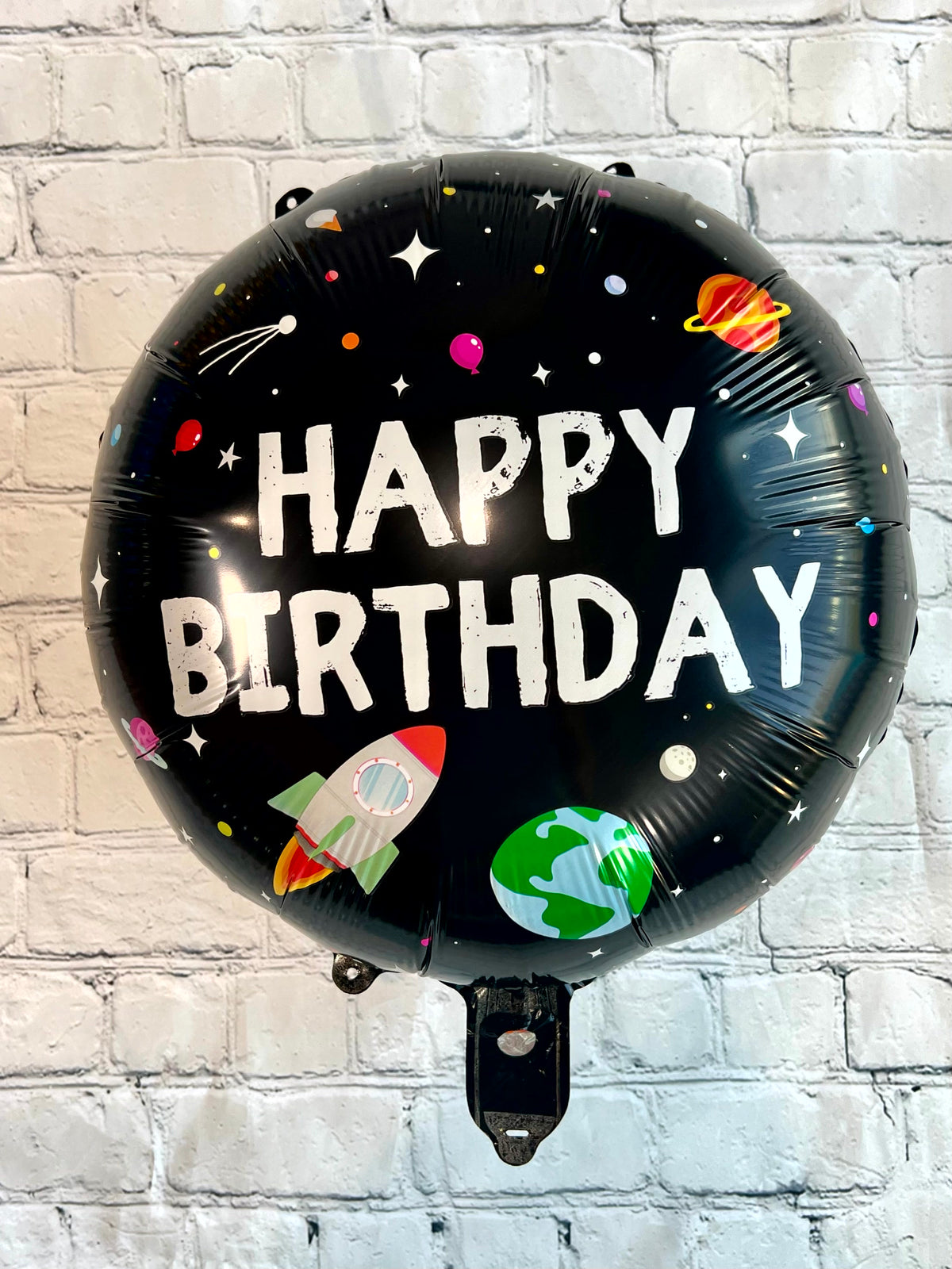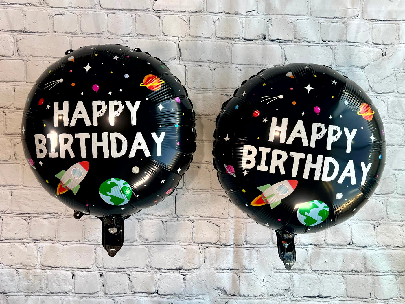 • Features one spaceship balloon about 25.5"x22.5", two blue star balloons 18", and two round happy birthday balloons 18"