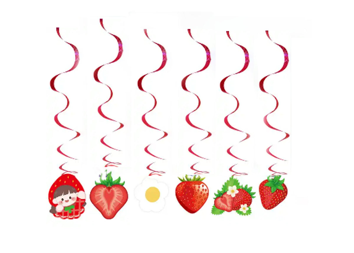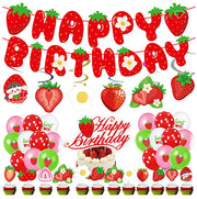 • Complete strawberry birthday decoration kit includes banner, cake topper, cupcake toppers, themed swirls, and printed latex balloons