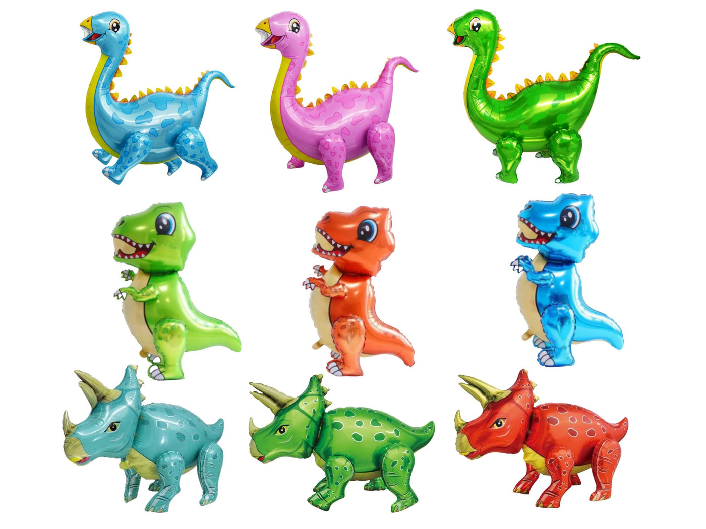 The 9 JUMBO SIZED DINOSAURS in this package are 3 Apatosaurus dinosaur mylar balloons (green, blue & pink - aprox. 28"L x 25"H) and 3 Triceratops dinosaur mylar balloons (teal, red & green - aprox. 30"L x 21.5"H) and 3 T-Rex dinosaur balloons (blue, orange & green - aprox. 20"L x 30.3"H) all with movable legs!